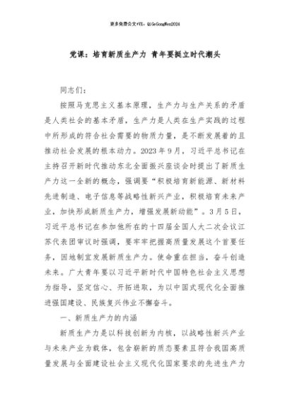 / 【七哥公文】2024年:党课:培育新质生产力 青年要挺立时代潮头+更多免费公文+VX:QiGeGongWen2024