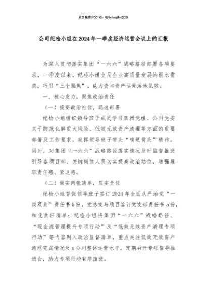 【七哥公文】2024年:公司纪检小组在2024年一季度经济运营会议上的汇报+更多免费公文+VX:QiGeGongWen2024