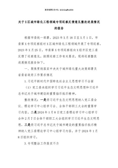 【七哥公文】2024年:关于X区城市绿化工程领域专项巡察反馈意见整改进展情况的报告+更多免费公文+VX:QiGeGongWen2024