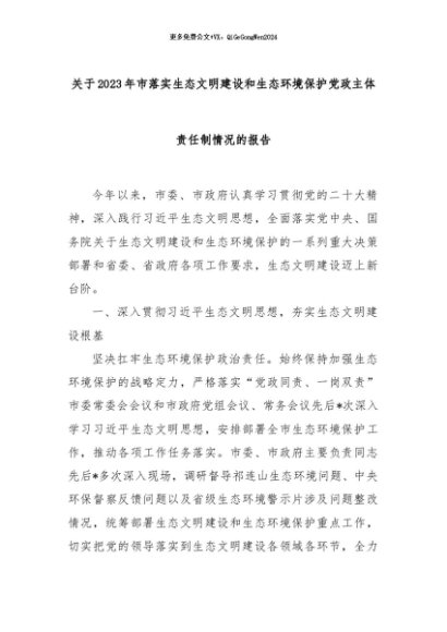 【七哥公文】2024年:关于2023年市落实生态文明建设和生态环境保护党政主体责任制情况的报告+更多免费公文+VX:QiGeGongWen2024