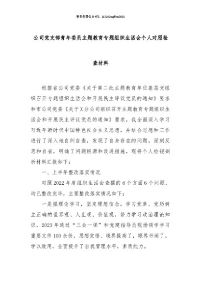【七哥公文】2024年:公司党支部青年委员主题教育专题组织生活会个人对照检查材料+更多免费公文+VX:QiGeGongWen2024