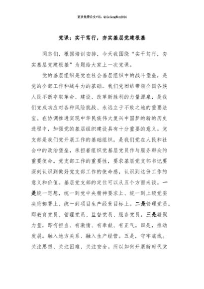 / 【七哥公文】2024年:党课:实干笃行,夯实基层党建根基+更多免费公文+VX:QiGeGongWen2024