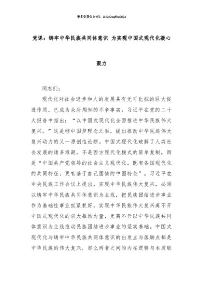 【七哥公文】2024年:党课:铸牢中华民族共同体意识 为实现中国式现代化凝心聚力+更多免费公文+VX:QiGeGongWen2024