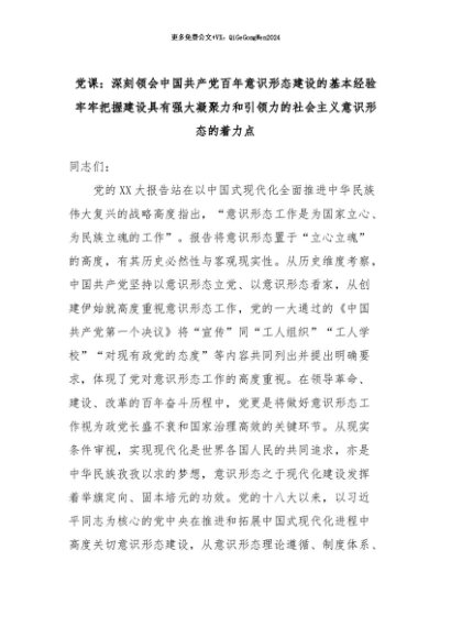 【七哥公文】2024年:党课:深刻领会中国共产党百年意识形态建设的基本经验牢牢把握建设具有强大凝聚力和引领力的社会主义意识形态的着力点+更多免费公文+VX:QiGeGongWen2024