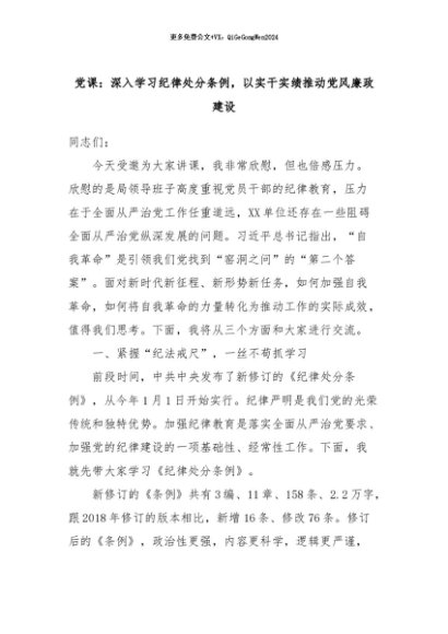 【七哥公文】2024年:党课:深入学习纪律处分条例,以实干实绩推动党风廉政建设+更多免费公文+VX:QiGeGongWen2024