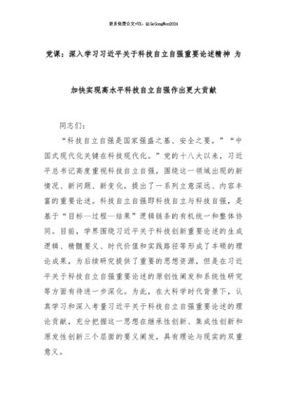 【七哥公文】2024年:党课:深入学习习近平关于科技自立自强重要论述精神 为加快实现高水平科技自立自强作出更大贡献+更多免费公文+VX:QiGeGongWen2024