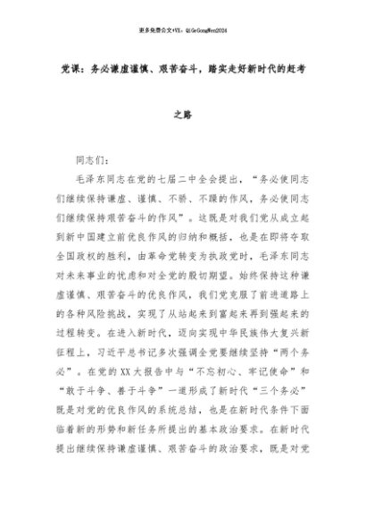 【七哥公文】2024年:党课:务必谦虚谨慎、艰苦奋斗,踏实走好新时代的赶考之路+更多免费公文+VX:QiGeGongWen2024