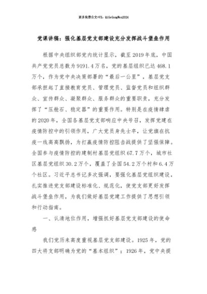 / 【七哥公文】2024年:党课讲稿:强化基层党支部建设充分发挥战斗堡垒作用+更多免费公文+VX:QiGeGongWen2024