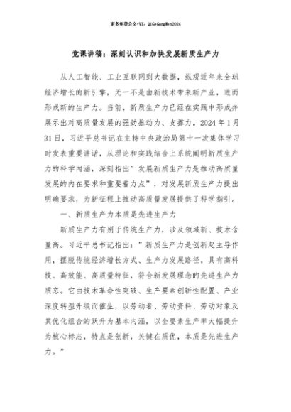 / 【七哥公文】2024年:党课讲稿:深刻认识和加快发展新质生产力+更多免费公文+VX:QiGeGongWen2024