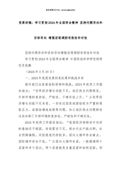 【七哥公文】2024年:党课讲稿:学习贯彻2024年全国两会精神 坚持问题导向和目标导向 增强宏观调控有效性针对性+更多免费公文+VX:QiGeGongWen2024