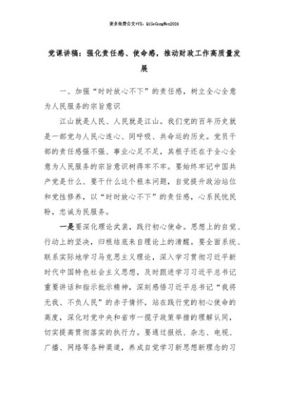 【七哥公文】2024年:党课讲稿:强化责任感、使命感,推动财政工作高质量发展+更多免费公文+VX:QiGeGongWen2024