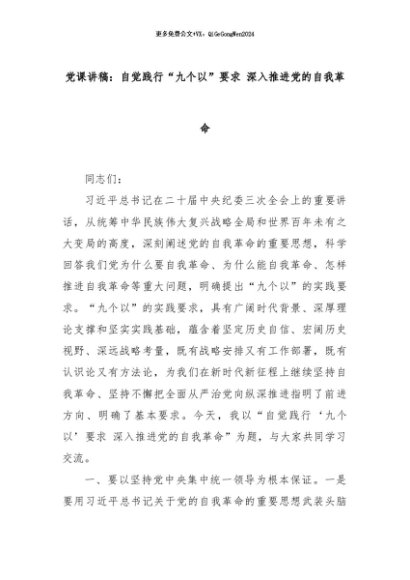 【七哥公文】2024年:党课讲稿:自觉践行“九个以”要求 深入推进党的自我革命+更多免费公文+VX:QiGeGongWen2024