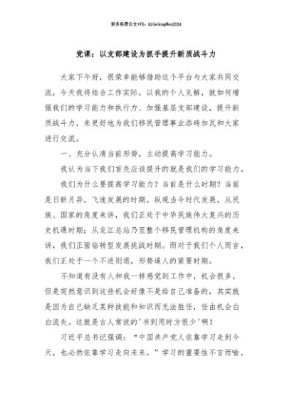 / 【七哥公文】2024年:党课:以支部建设为抓手提升新质战斗力+更多免费公文+VX:QiGeGongWen2024