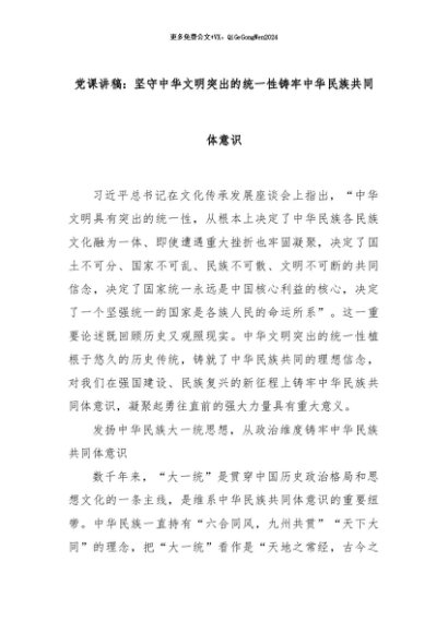 【七哥公文】2024年:党课讲稿:坚守中华文明突出的统一性铸牢中华民族共同体意识+更多免费公文+VX:QiGeGongWen2024