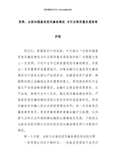 【七哥公文】2024年:党课:全面加强基层党风廉政建设 为行业高质量发展保驾护航+更多免费公文+VX:QiGeGongWen2024