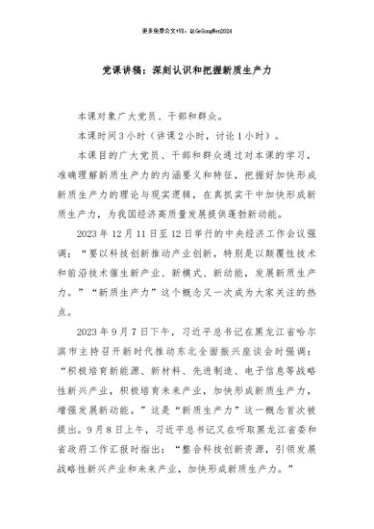 / 【七哥公文】2024年:党课讲稿:深刻认识和把握新质生产力+更多免费公文+VX:QiGeGongWen2024