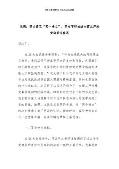 【七哥公文】2024年:党课:坚决捍卫“两个确立”,坚定不移推进全面从严治党向纵深发展+更多免费公文+VX:QiGeGongWen2024