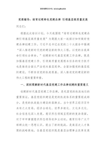 【七哥公文】2024年:党课辅导:培育过硬特色党建品牌 引领基层高质量发展+更多免费公文+VX:QiGeGongWen2024