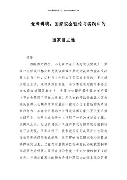 / 【七哥公文】2024年:党课讲稿:国家安全理论与实践中的国家自主性+更多免费公文+VX:QiGeGongWen2024