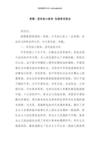 / 【七哥公文】2024年:党课:坚定初心使命 弘扬责任担当+更多免费公文+VX:QiGeGongWen2024