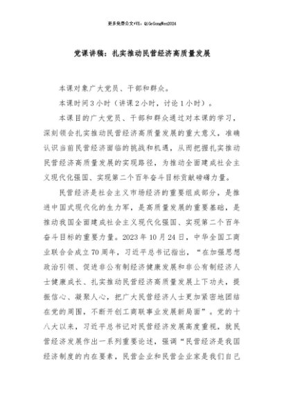 / 【七哥公文】2024年:党课讲稿:扎实推动民营经济高质量发展+更多免费公文+VX:QiGeGongWen2024