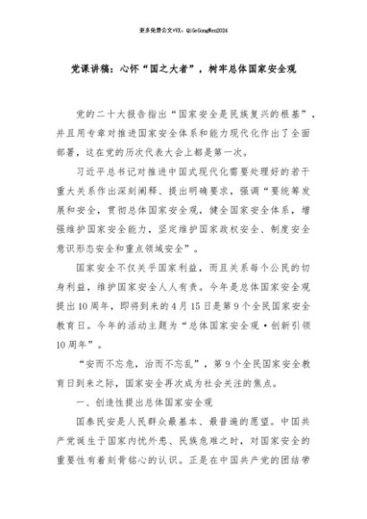/ 【七哥公文】2024年:党课讲稿:心怀“国之大者”,树牢总体国家安全观+更多免费公文+VX:QiGeGongWen2024
