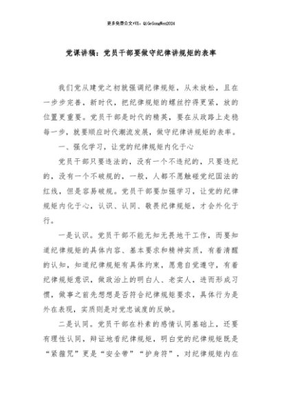 / 【七哥公文】2024年:党课讲稿:党员干部要做守纪律讲规矩的表率+更多免费公文+VX:QiGeGongWen2024