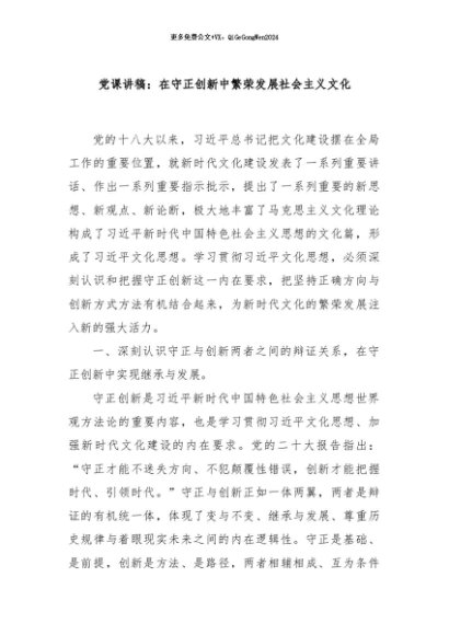 / 【七哥公文】2024年:党课讲稿:在守正创新中繁荣发展社会主义文化+更多免费公文+VX:QiGeGongWen2024