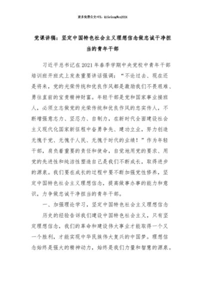 【七哥公文】2024年:党课讲稿:坚定中国特色社会主义理想信念做忠诚干净担当的青年干部+更多免费公文+VX:QiGeGongWen2024