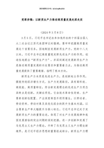 / 【七哥公文】2024年:党课讲稿:以新质生产力推动高质量发展走深走实+更多免费公文+VX:QiGeGongWen2024