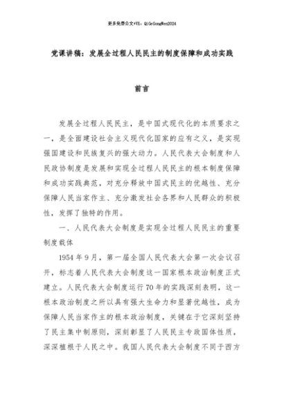 / 【七哥公文】2024年:党课讲稿:发展全过程人民民主的制度保障和成功实践+更多免费公文+VX:QiGeGongWen2024