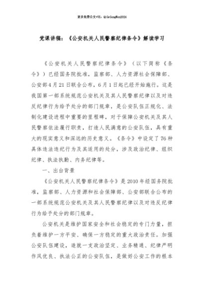 / 【七哥公文】2024年:党课讲稿:《公安机关人民警察纪律条令》解读学习+更多免费公文+VX:QiGeGongWen2024