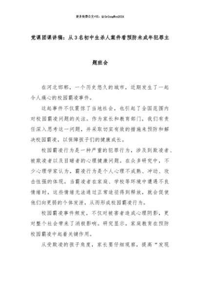 【七哥公文】2024年:党课团课讲稿:从3名初中生杀人案件看预防未成年犯罪主题班会+更多免费公文+VX:QiGeGongWen2024