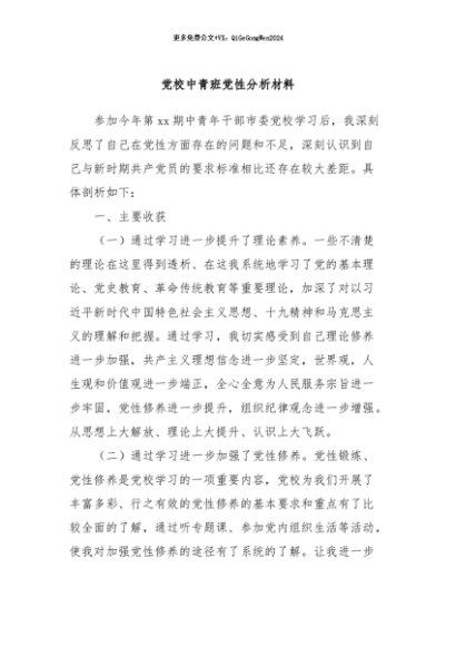 / 【七哥公文】2024年:党校中青班党性分析材料+更多免费公文+VX:QiGeGongWen2024