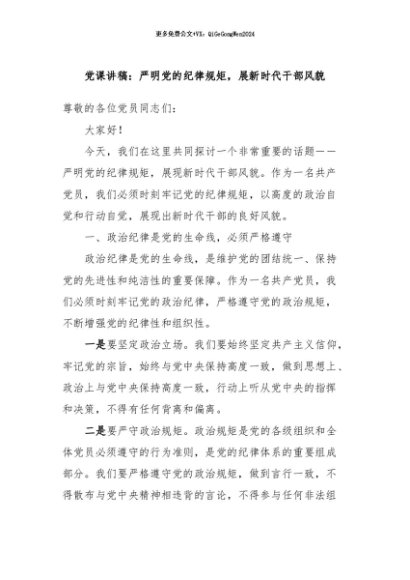 / 【七哥公文】2024年:党课讲稿:严明党的纪律规矩,展新时代干部风貌+更多免费公文+VX:QiGeGongWen2024