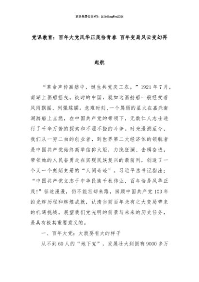 【七哥公文】2024年:党课教育:百年大党风华正茂恰青春 百年变局风云变幻再起航+更多免费公文+VX:QiGeGongWen2024