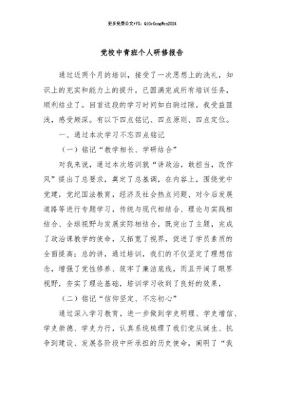 / 【七哥公文】2024年:党校中青班个人研修报告+更多免费公文+VX:QiGeGongWen2024