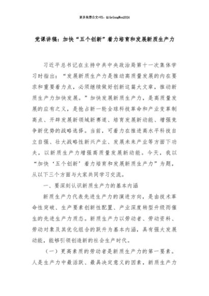 【七哥公文】2024年:党课讲稿:加快“五个创新”着力培育和发展新质生产力.+更多免费公文+VX:QiGeGongWen2024