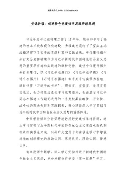 / 【七哥公文】2024年:党课讲稿:创建特色党建馆学思践悟新思想+更多免费公文+VX:QiGeGongWen2024