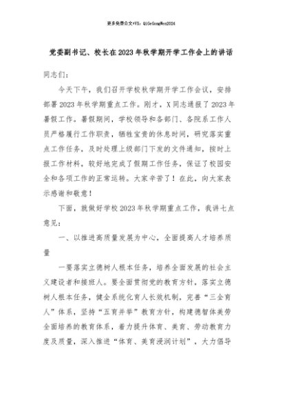 【七哥公文】2024年:党委副书记、校长在2023年秋学期开学工作会上的讲话+更多免费公文+VX:QiGeGongWen2024