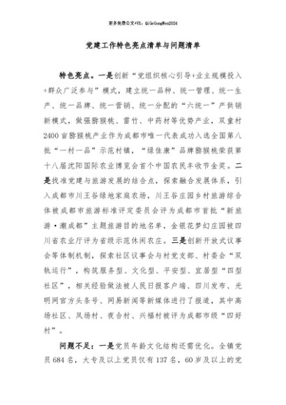 / 【七哥公文】2024年:党建工作特色亮点清单与问题清单+更多免费公文+VX:QiGeGongWen2024