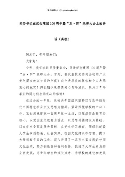 【七哥公文】2024年:党委书记在纪念建团100周年暨“五·四”表彰大会上的讲话(高校)+更多免费公文+VX:QiGeGongWen2024