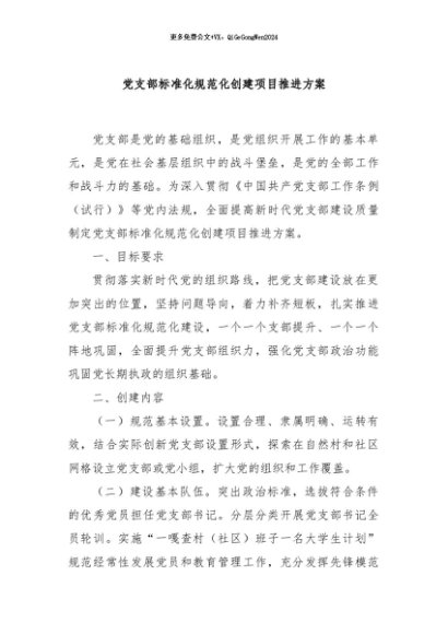 / 【七哥公文】2024年:党支部标准化规范化创建项目推进方案+更多免费公文+VX:QiGeGongWen2024