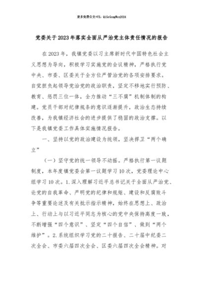 【七哥公文】2024年:党委关于2023年落实全面从严治党主体责任情况的报告+更多免费公文+VX:QiGeGongWen2024