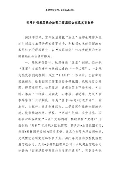 / 【七哥公文】2024年:党建引领基层社会治理工作座谈会交流发言材料+更多免费公文+VX:QiGeGongWen2024