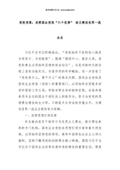 【七哥公文】2024年:党校党课:发挥国企党校“六个优势” 助力建设世界一流企业+更多免费公文+VX:QiGeGongWen2024