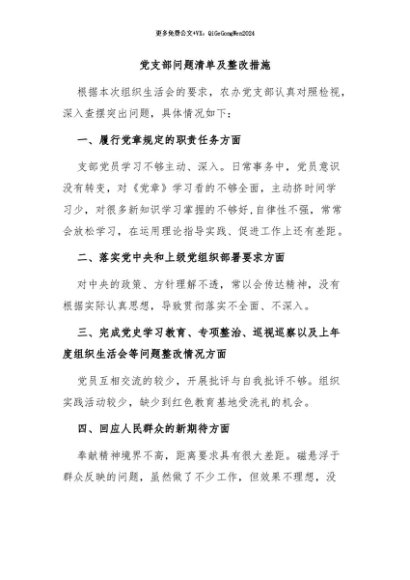 【七哥公文】2024年:党支部问题清单及整改措施+更多免费公文+VX:QiGeGongWen2024