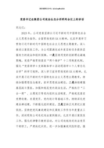 / 【七哥公文】2024年:党委书记在集团公司政治生态分析研判会议上的讲话+更多免费公文+VX:QiGeGongWen2024