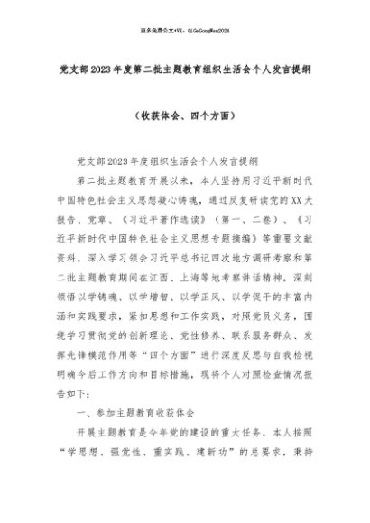 【七哥公文】2024年:党支部2023年度第二批主题教育组织生活会个人发言提纲(收获体会、四个方面)+更多免费公文+VX:QiGeGongWen2024