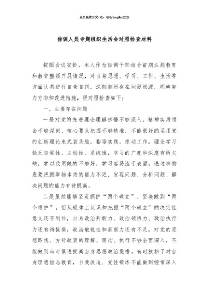 / 【七哥公文】2024年:借调人员专题组织生活会对照检查材料+更多免费公文+VX:QiGeGongWen2024